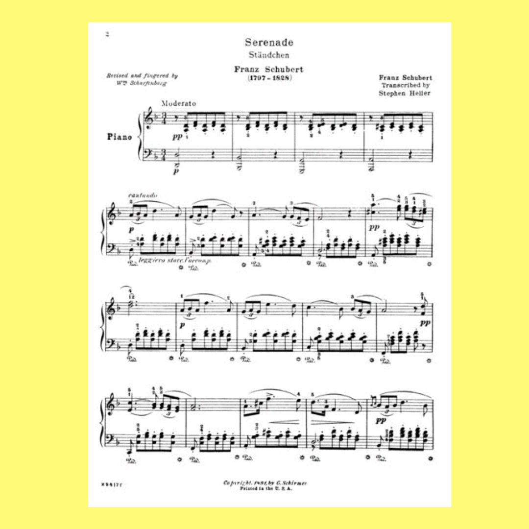 The Schubert - 'Serenade for Piano' sheet music features the timeless and well-loved composition by Austrian composer Franz Schubert. This sheet music provides pianists with accurate and clear notation, allowing them to faithfully recreate and perform this elegant and influential piece. With precise markings and attention to detail, it serves as an essential resource for musicians looking to master Schubert's beautiful *Serenade* and explore its lyrical depth and charm. Ideal for pianists of various skill levels.