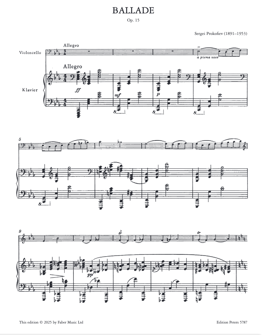 Sergei Prokofiev – Ballade for Cello and Piano Op. 15 is a striking work from the composer’s student years, offering a powerful glimpse into the bold harmonic language and dramatic contrasts that would later define his style. Composed in 1912 and published here in the trusted Edition Peters, the Ballade grew from an earlier violin sonata sketch and stands as an important milestone in Prokofiev’s early output.