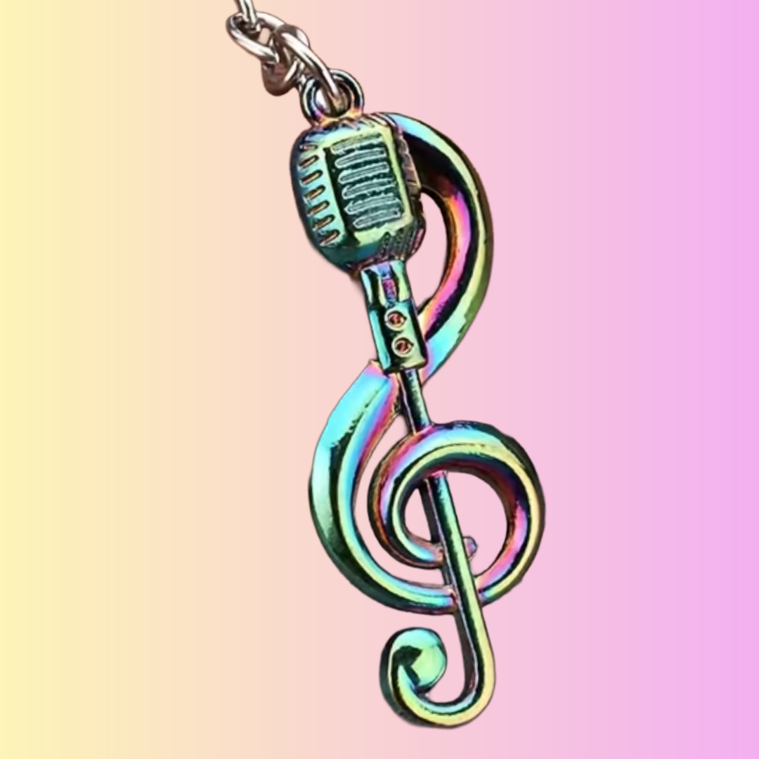 Add a touch of vintage stage charm to your everyday carry with this stylish retro microphone keychain, finished in an eye-catching holographic rainbow coating. Inspired by classic broadcast microphones, the design features a curved treble clef base that blends timeless music heritage with modern colour.