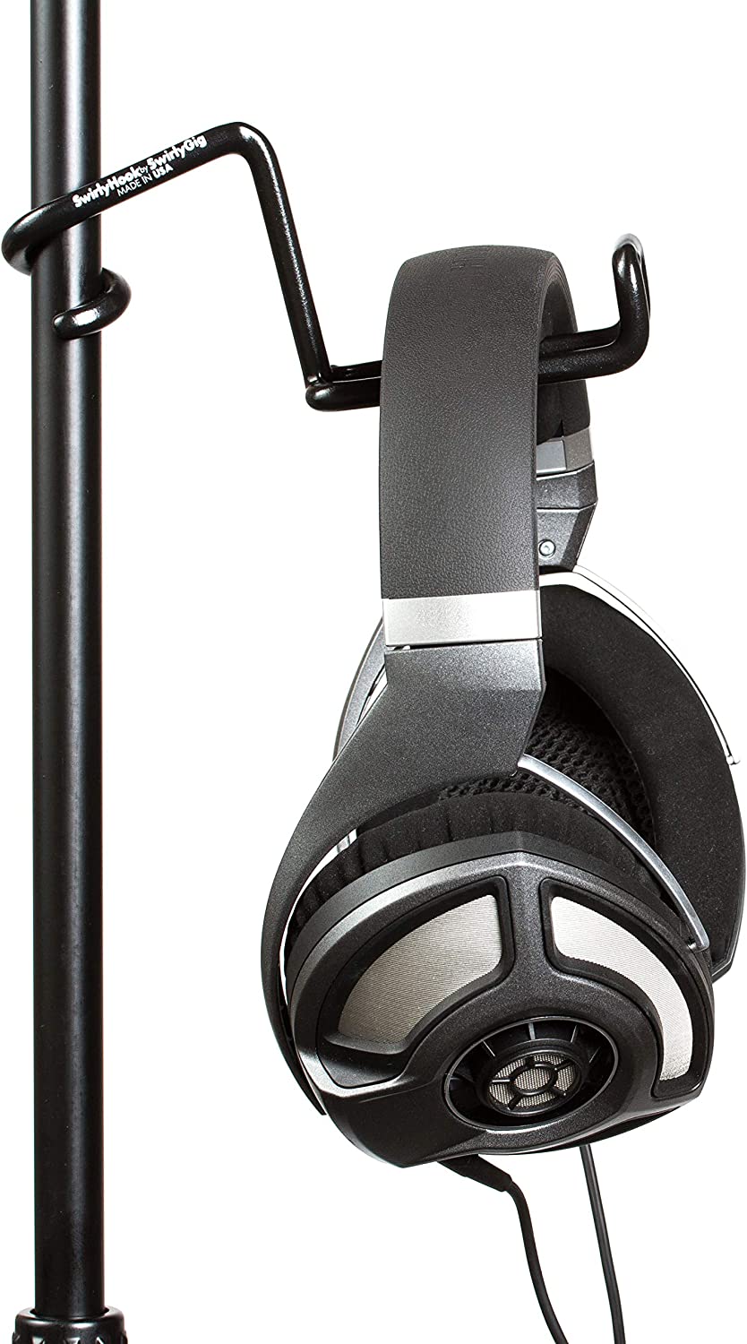 The Swirlyhook 1/2 Accessory Holder is a versatile tool that can be used for a variety of purposes. Designed to fit snugly on a standard mic stand or any vertical 1/2-inch tubing, this resilient spring steel accessory holder is coated in black PVC for grip and durability. It's perfect for holding headphones, tambourines, cables, and other accessories you may need while performing or recording.