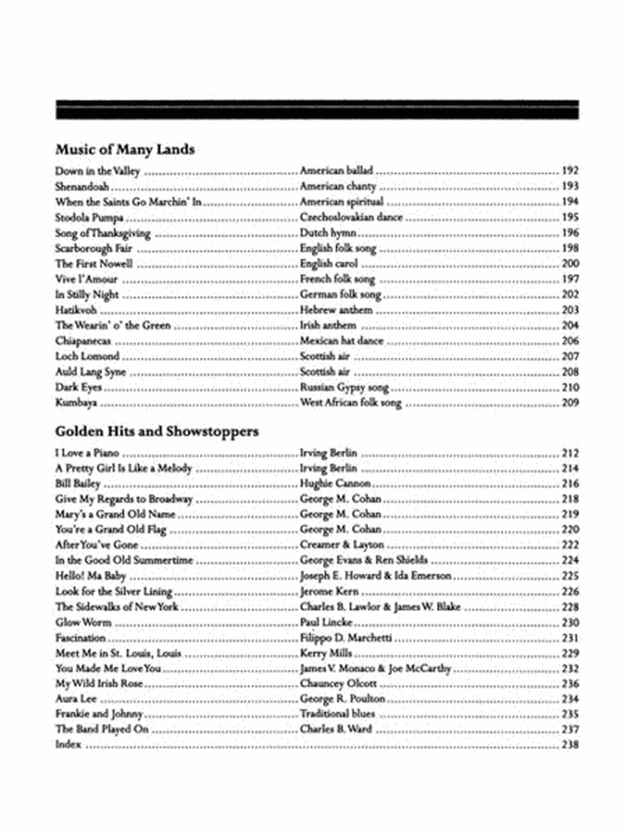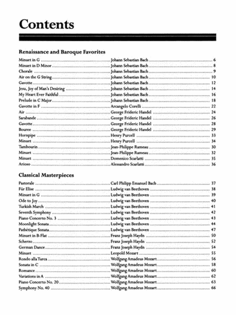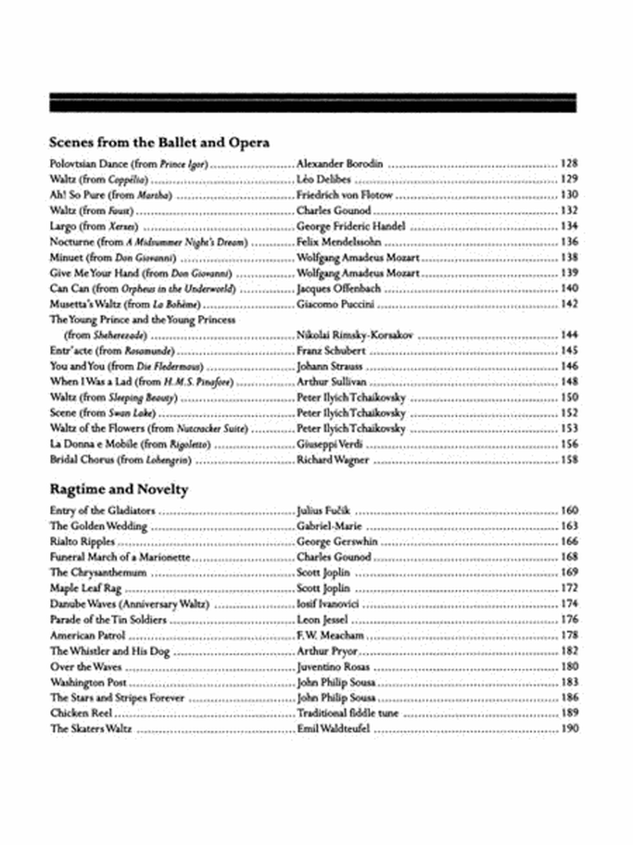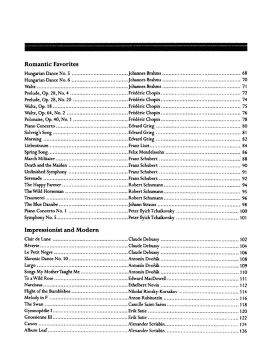 This expansive collection brings together 140 of the world's greatest classical and popular piano pieces, specially arranged for the developing pianist. Spanning every musical era, this songbook includes beloved piano solos from renowned composers such as Bach, Beethoven, Brahms, Chopin, Debussy, Fauré, Handel, Haydn, Scott Joplin, Mozart, Tchaikovsky, and many more. Perfect for pianists looking to explore a wide range of styles and eras, this compilation offers rewarding and enjoyable piano arrangements. 239 pages.