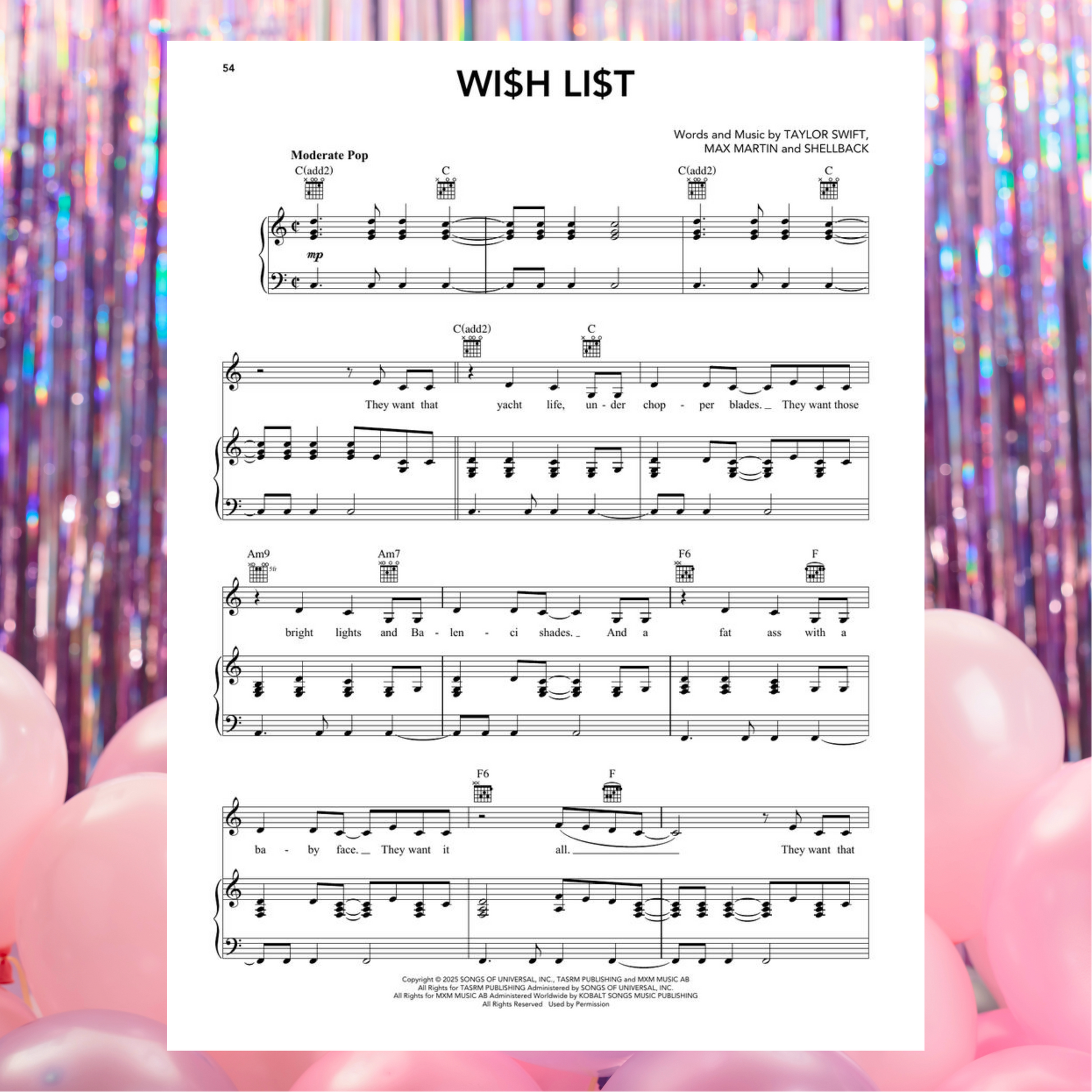 Make space on your Eras shelf! Be the first to get your hands on the official songbook of Taylor Swift's Life of a Showgirl. From the songs that break your heart to the ones you'll have on repeat, play or sing every moment of Taylor's latest era with the complete sheet music collection. All twelve pop tracks are expertly arranged for piano/vocal/guitar, feature guitar chord symbols, and complete lyrics. 88 pages.