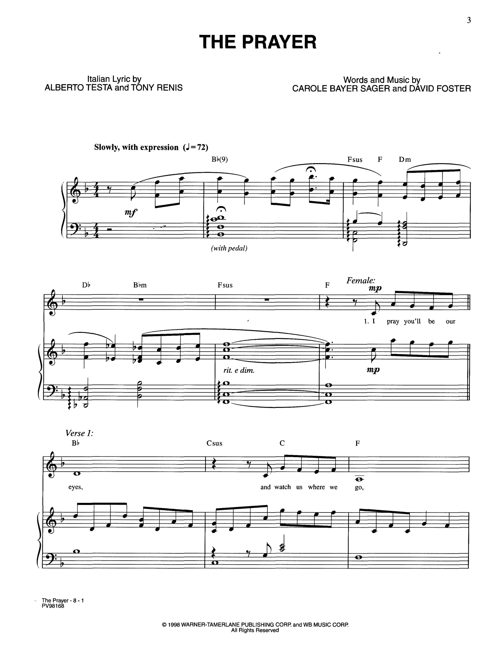 "The Prayer," as recorded by Celine Dion and Andrea Bocelli, in standard Piano/Vocal/Guitar sheet music. Includes Italian and English lyrics.