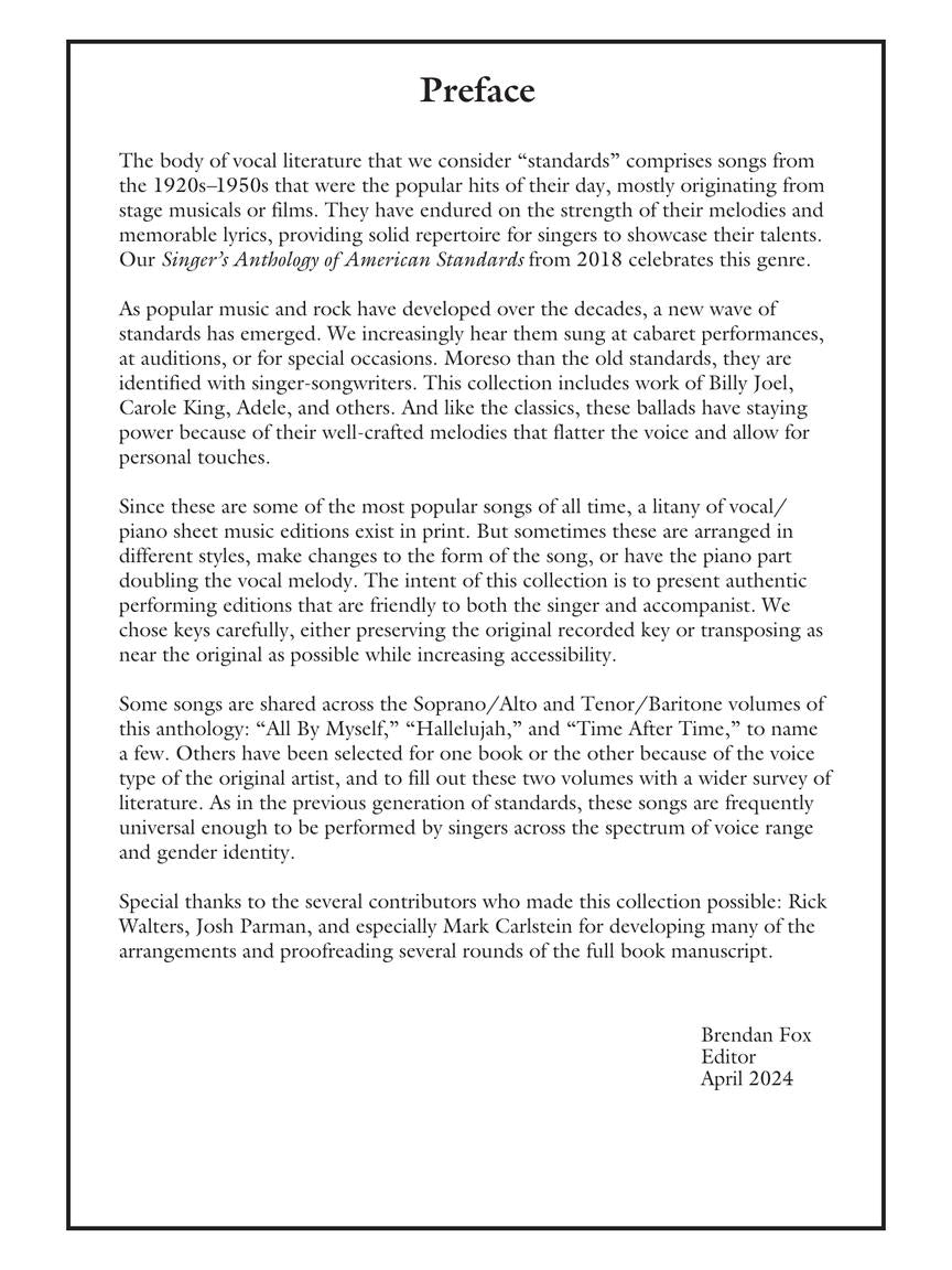 Designed as authentic performing editions, these arrangements are accessible for both singers and accompanists. The keys have been thoughtfully selected to maintain the original recorded key or transpose closely to it for ease of performance. This anthology comes in separate editions for Soprano/Alto and Tenor/Baritone, with some songs shared and others specific to each voice type. With 216 pages of material, this collection is a valuable addition to any vocalist's repertoire.
