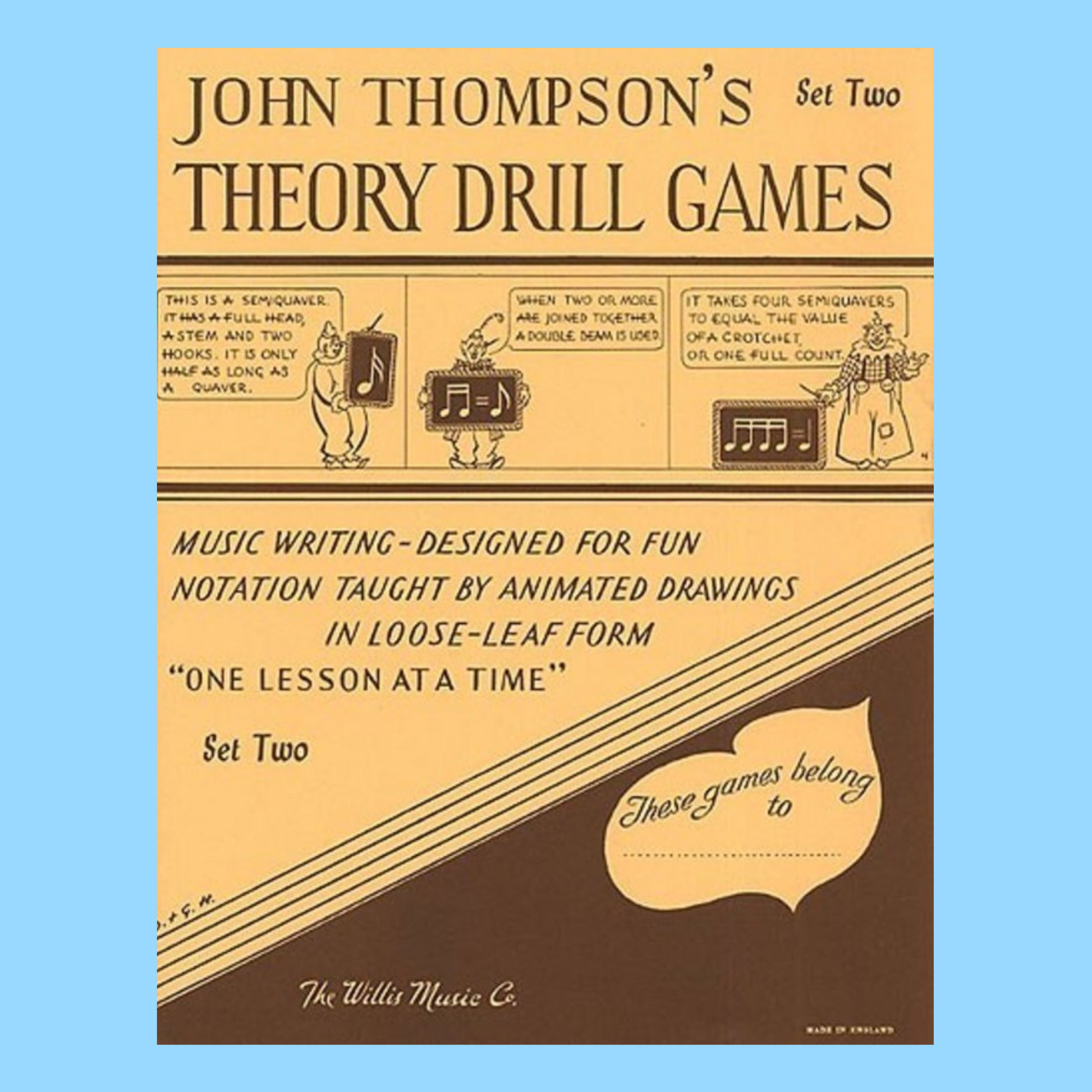 Set Two of John Thompson's Theory Drill Games provides more lessons in loose-leaf form that teach notation, time, rhythm, and other musical rudiments with the help of animated drawings. This book is a continuation of the first set and builds upon the foundational concepts introduced in Set One.
