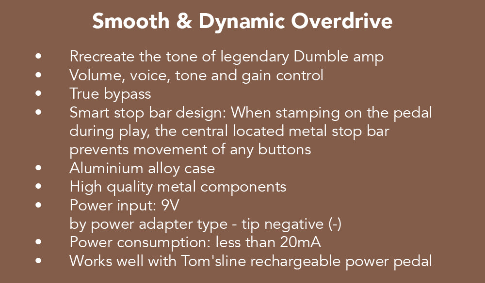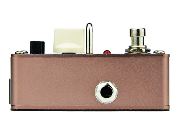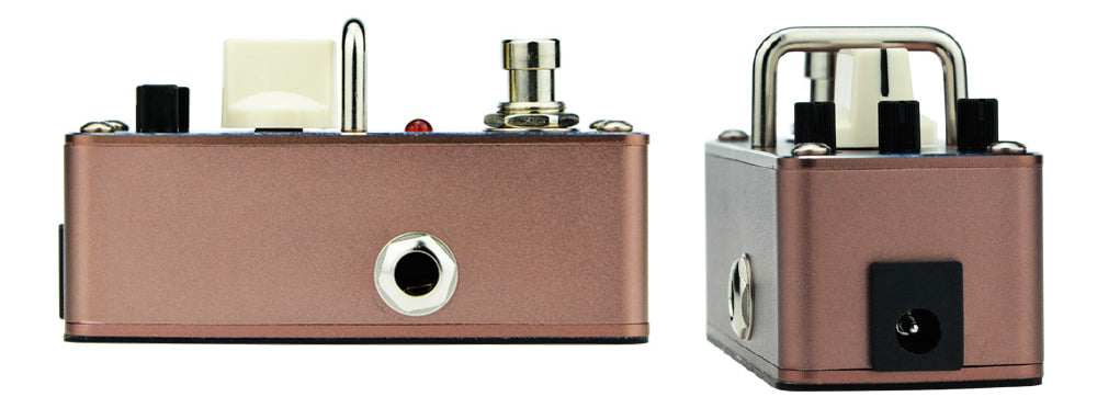 Toms Line pedals are built with a tough aluminium chassis and high-quality components, with a protective stop-bar to avoid bumping your controls when engaging the pedal. They are powered from a top-mounted, standard 9v centre-negative power supply, and feature side-mounted 1/4" jacks.