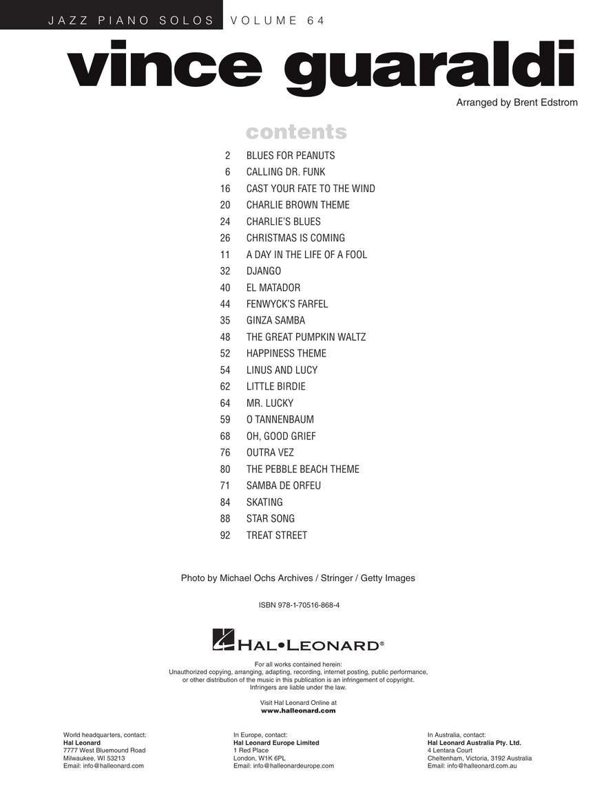 The "Vince Guaraldi - Jazz Piano Solos Series Volume 64 Songbook" is a delightful collection of 24 beloved favourites arranged for piano. In this book, you'll find Vince Guaraldi's iconic compositions, including cherished tunes from the Peanuts® TV specials. Each arrangement is thoughtfully crafted, featuring chord names to help pianists navigate these classic songs with ease.