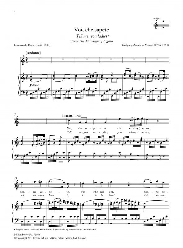 Delight in the timeless charm of Wolfgang Amadeus Mozart's "Voi che sapete" from "The Marriage of Figaro" with this Edition Peters edition for high, medium, and low voice. Presented in the innovative "3-keys-in-1" Series format—C, Bb (original), A—this edition provides unparalleled versatility for vocalists.